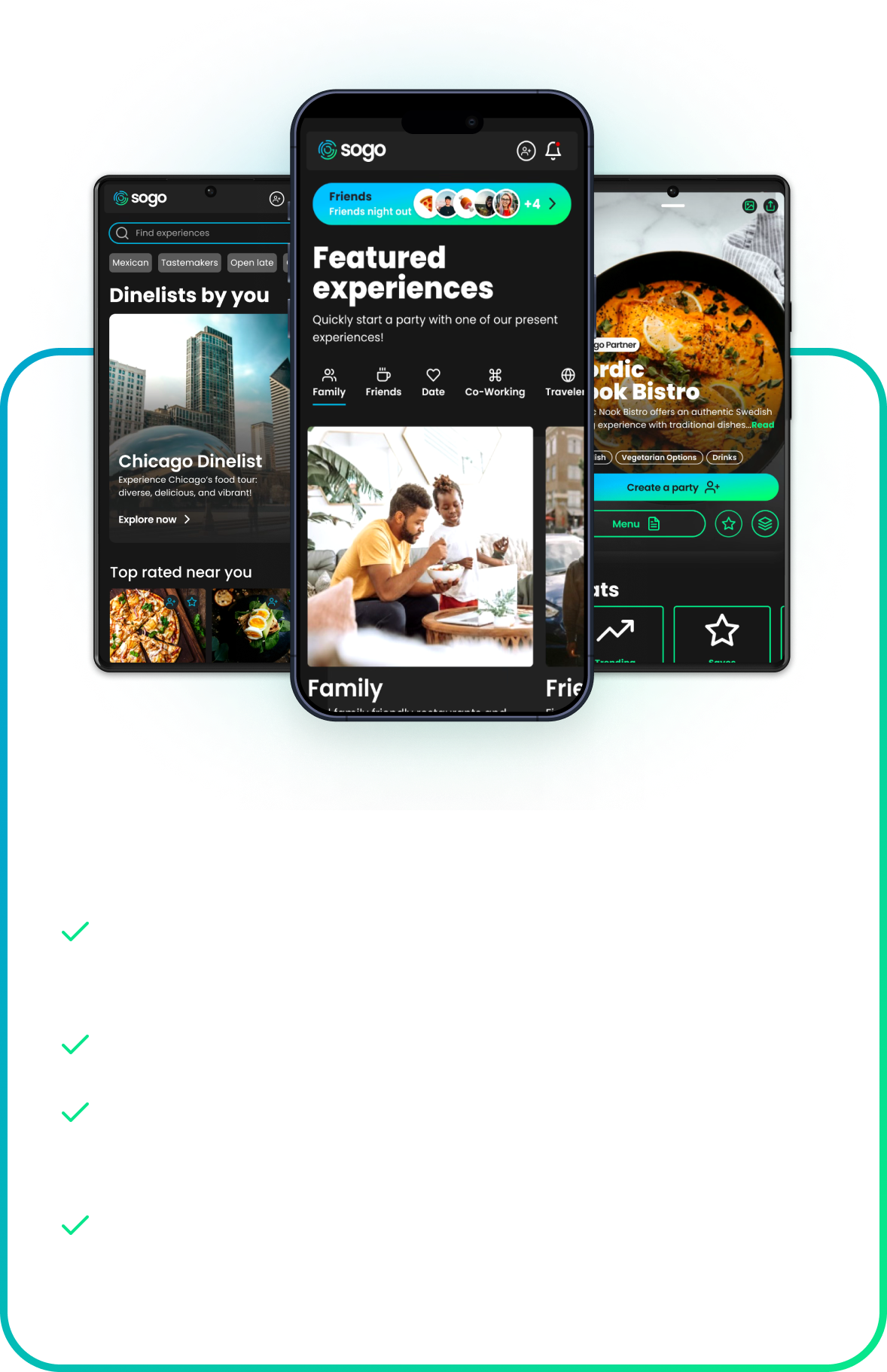 With SoGo’s party feature, it’s easy to find a spot everyone will love. Collaborate with friends and get a group-friendly pick—because dining out is better together.